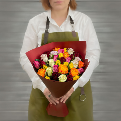 Букет из 39 разноцветных роз в упаковке Кения 40 см.| 2 400 Р | без скидки |