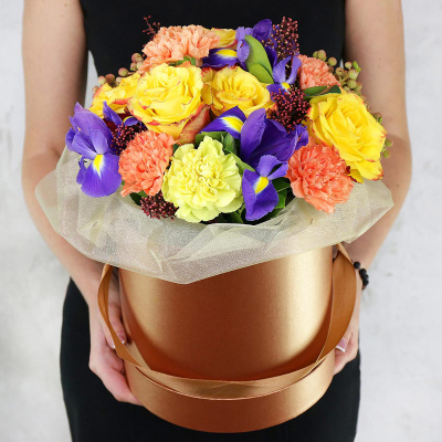 Композиция Стрельцу из роз, ирисов и гвоздик в шляпной коробке| 6 400 Р | без скидки |