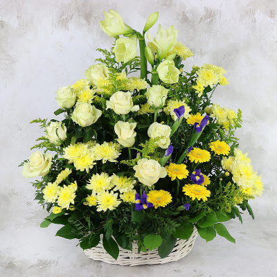 Траурная композиция из роз, ирисов и хризантем| 24 700 Р | без скидки |