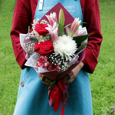 Композиция из лилий, гвоздики и роз| 26 400 Р | без скидки |