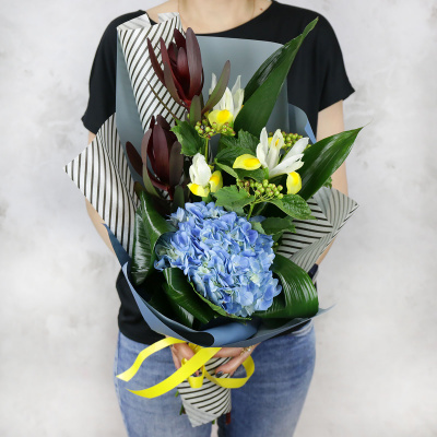 Гортензия,Ирис желтый,Вибурнум калина ,Леукоспермум,Листья аспидистра,Упаковка в ассортименте,Лента,Плёнка прозрачная