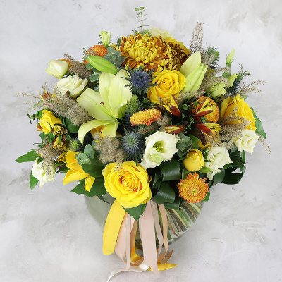 Букет из лилии, роз, эрингиума и лизиантуса| 15 900 Р | без скидки |