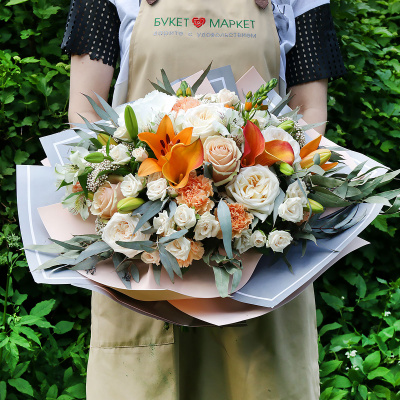 Гортензия белая, Калла 60 см белая, Лилия азия красная, Гвоздика оранжевая, Роза Гринроуз 60 см фиолетовая, Роза Эквадор 60 см розовая, Озатамнус, Роза кустовая 50 см оранжевая, Орнитогалум, Альстромерия желтая, Листья эвкалипт, Упаковка в ассортименте, Лента, Плёнка прозрачная
