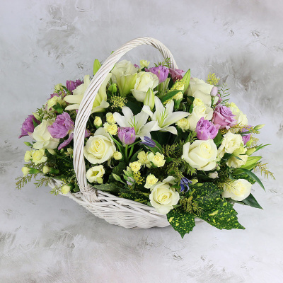 Корзина плетеная стандарт бол, Оазис кирпич, Гвоздика кустовая белая, Лизиантус, Лилия вост белая, Тюльпан ВС желтый, Роза Эквадор 60 см розовая, Лилия азия красная, Клематис фиолетовый, Мимоза цветущая, Листья аукуба, Листья питтоспорума микс, Плёнка прозрачная