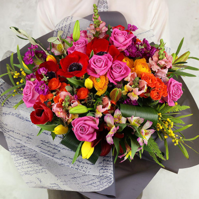 Букет Овну из лилий, роз, анемонов и тюльпанов с листьями хедеры| 21 600 Р | без скидки |