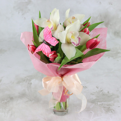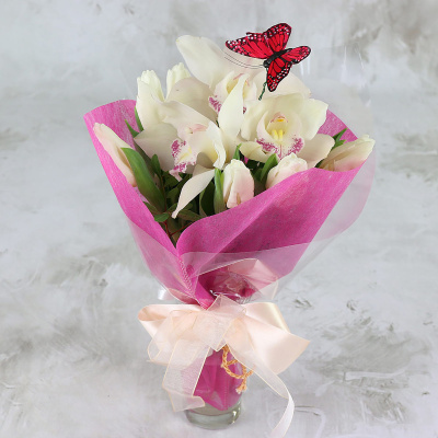 Тюльпан малиновый, Орхидея Цимбидиум белая, Листья фисташки, Бабочка, Конус для букета, Плёнка прозрачная