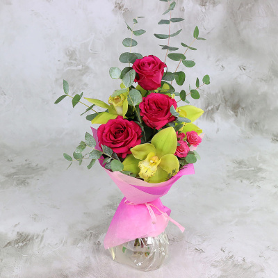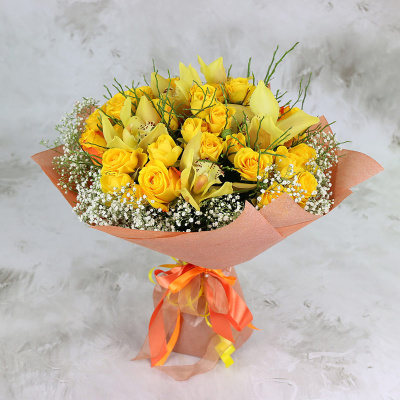 Букет из роз и желтых орхидей в упаковке| 5 000 Р | без скидки |