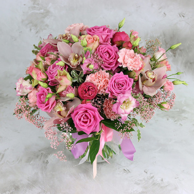 Букет из розовых роз, лизиантуса и орхидей| 19 400 Р | без скидки |