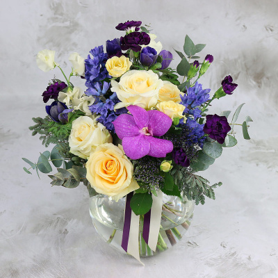 Букет из кремовых роз, гиацинтов и орхидеи| 12 800 Р | без скидки |