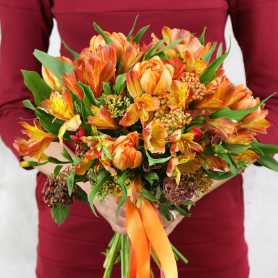 Букет из альстромерий, тюльпанов, фрезий и ахилей| 6 200 Р | без скидки |