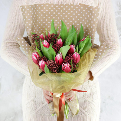 Тюльпан малиновый, Скимия рубелла, Упаковка в ассортименте, Лента, Плёнка прозрачная