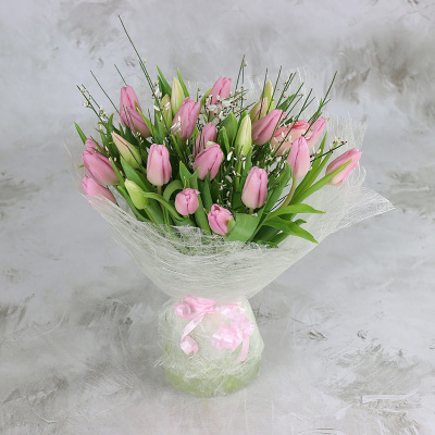 Букет из 25 розовых тюльпанов в упаковке| 6 400 Р | без скидки |
