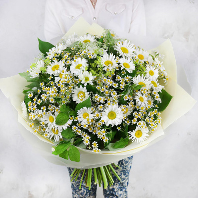 Большой букет из ромашек, альхимелл и листьев малины| 18 700 Р | без скидки |