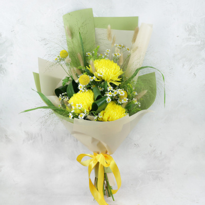 Хризантема одноголовая,Краспедия,Паникум,Ромашка (Танасетум),Листья аспидистра,Лагурус сушёный,Упаковка в ассортименте,Лента,Плёнка прозрачная