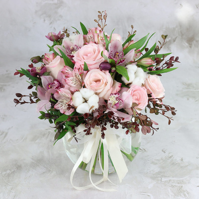 Букет из альстромерий, роз и хлопка| 10 500 Р | без скидки |
