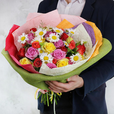 Авторский букет из роз, гвоздик и ромашек в оригинальной упаковке| 9 300 Р | без скидки |