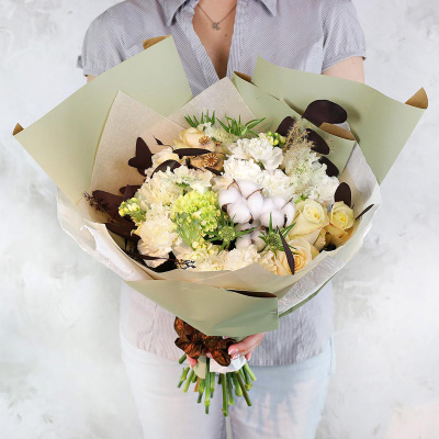 Букет из хризантем, роз и гвоздик в оригинальной упаковке| 6 400 Р | без скидки |