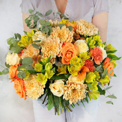 Хризантема одноголовая розовая, Гвоздика оранжевая, Альстромерия желтая, Роза РС 50 см красная, Роза кустовая 50 см оранжевая, Листья эвкалипт с яг/цв/краш, Листья салал, Упаковка в ассортименте, Лента, Плёнка прозрачная