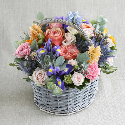Корзина плетеная стандарт бол, Оазис кирпич, Роза Эквадор 60 см розовая, Роза Вувузела кремовая, Ирис, Роза кустовая 60 см кремовая, Гвоздика оранжевая, Эрингиум, Роза кустовая 60 см кремовая, Роза кустовая 60 см кремовая, Гиацинт синий, Гиацинт синий, Листья дуба (пучок), Листья эвкалипт микс, Капс Бруниа, Плёнка прозрачная, Лента с логотипом (ББ)