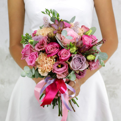 Листья эвкалипт микс, Листья эвкалипт с яг/цв/краш, Роза кустовая 40 см розовая, Гвоздика кустовая белая, Лизиантус, Трахелиум фиолетовый, Гиацинт синий, Бовардия фиолетовая, Роза Эквадор 60 см розовая, Лента, Плёнка прозрачная