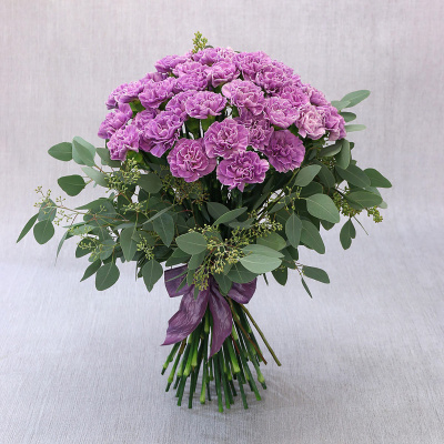 Гвоздика лунная фиолетовая, Листья эвкалипт с яг/цв/краш, Лента, Плёнка прозрачная
