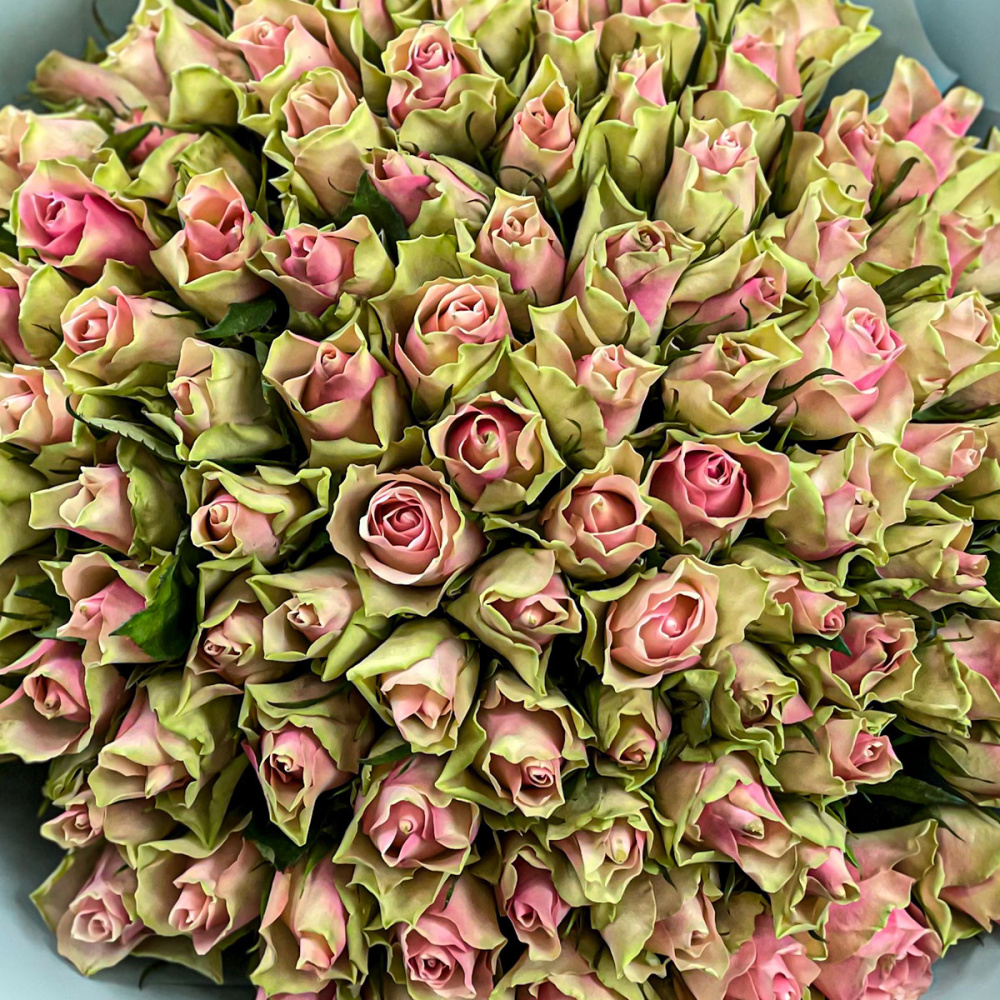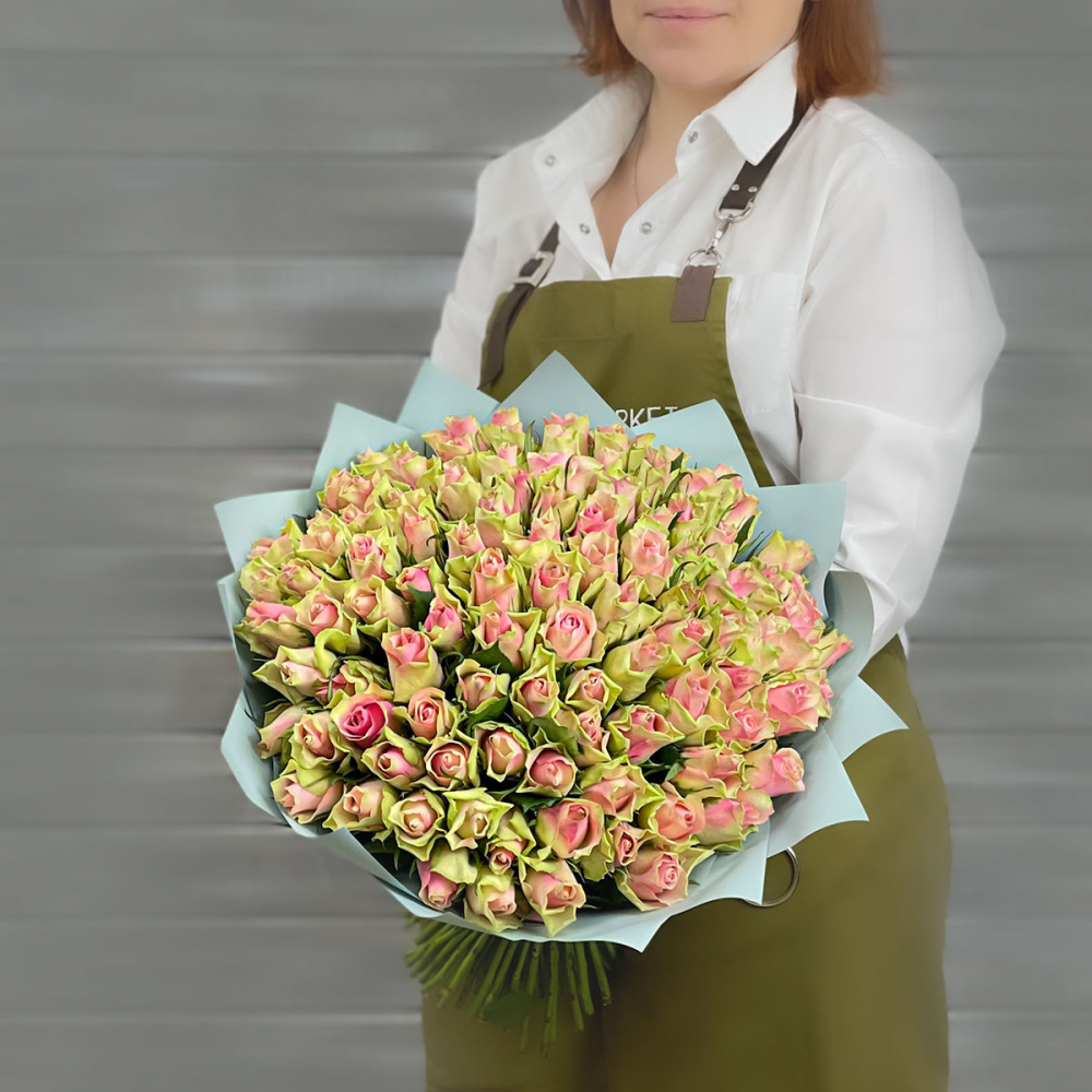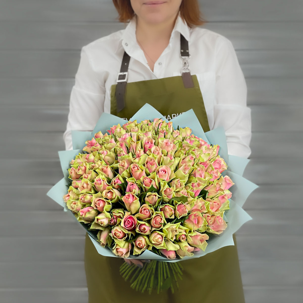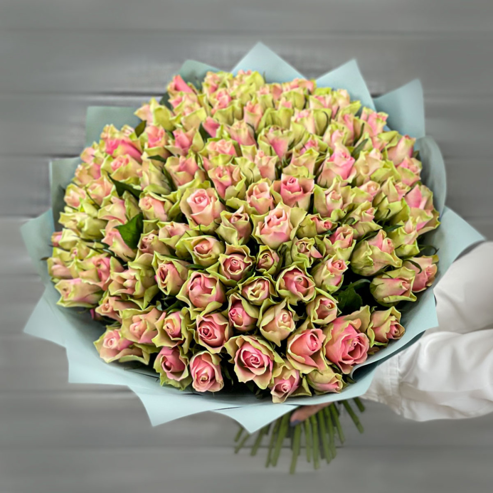 Букет из 101 зелено-розовой розы в упаковке Кения 40 см.