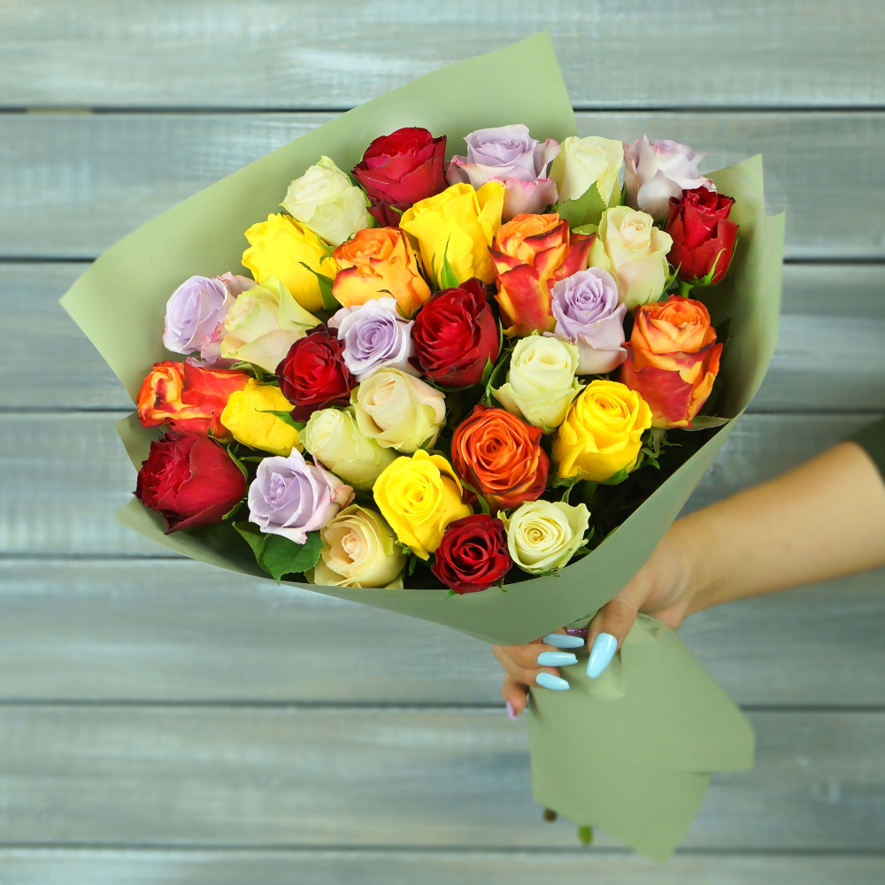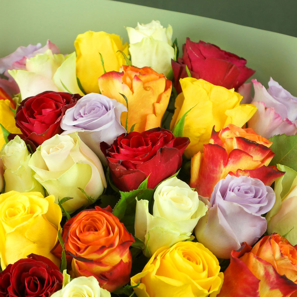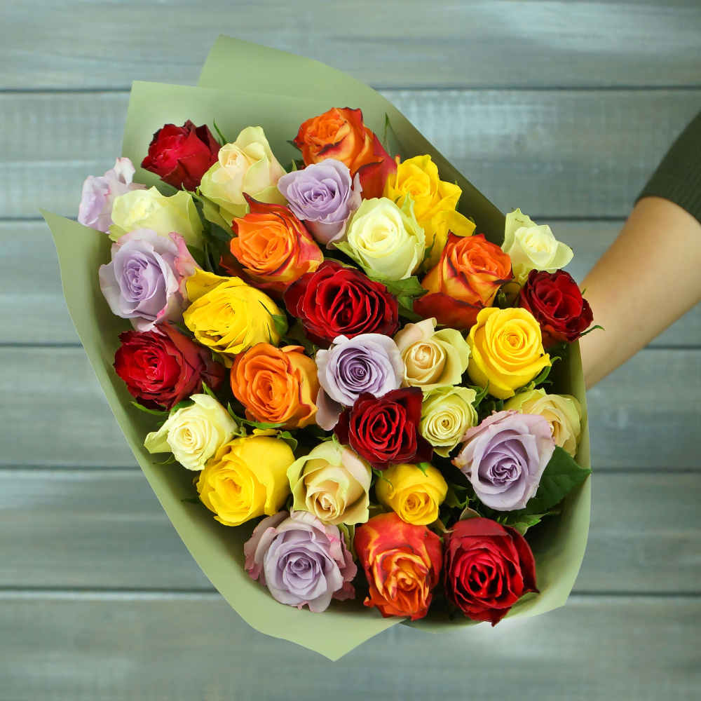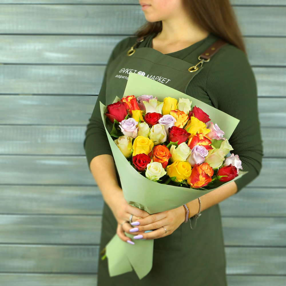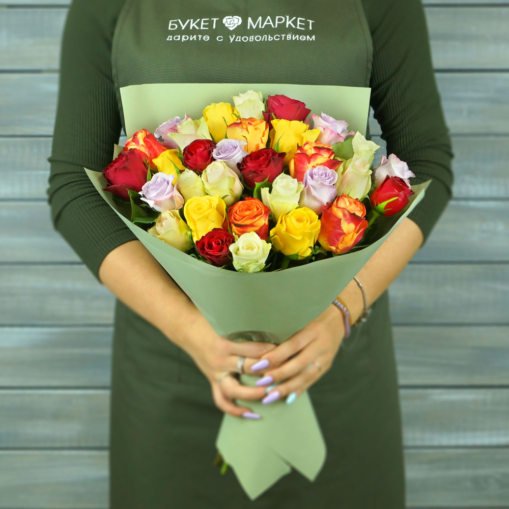 Букет из 29 разноцветных роз в упаковке Кения 40 см.