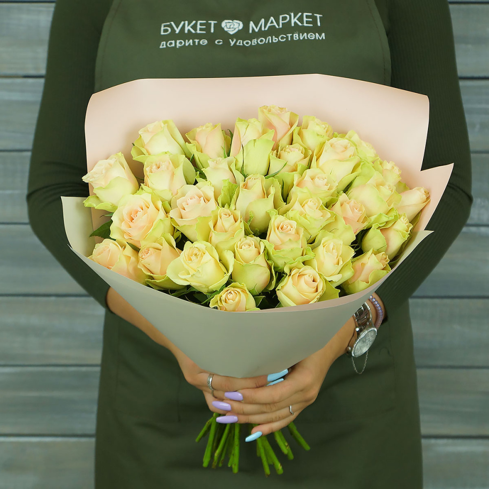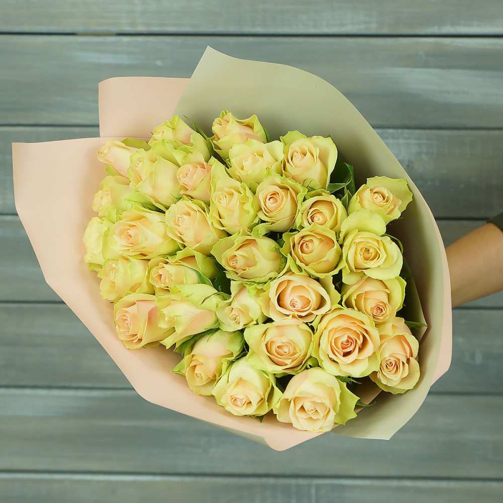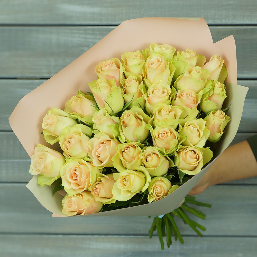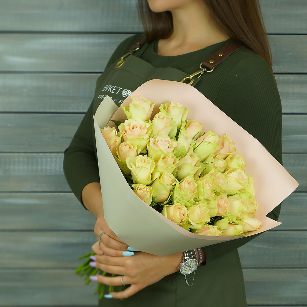 Букет из 29 зелено-розовых роз в упаковке Кения 40 см.