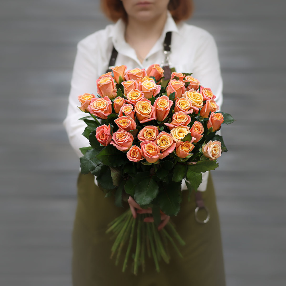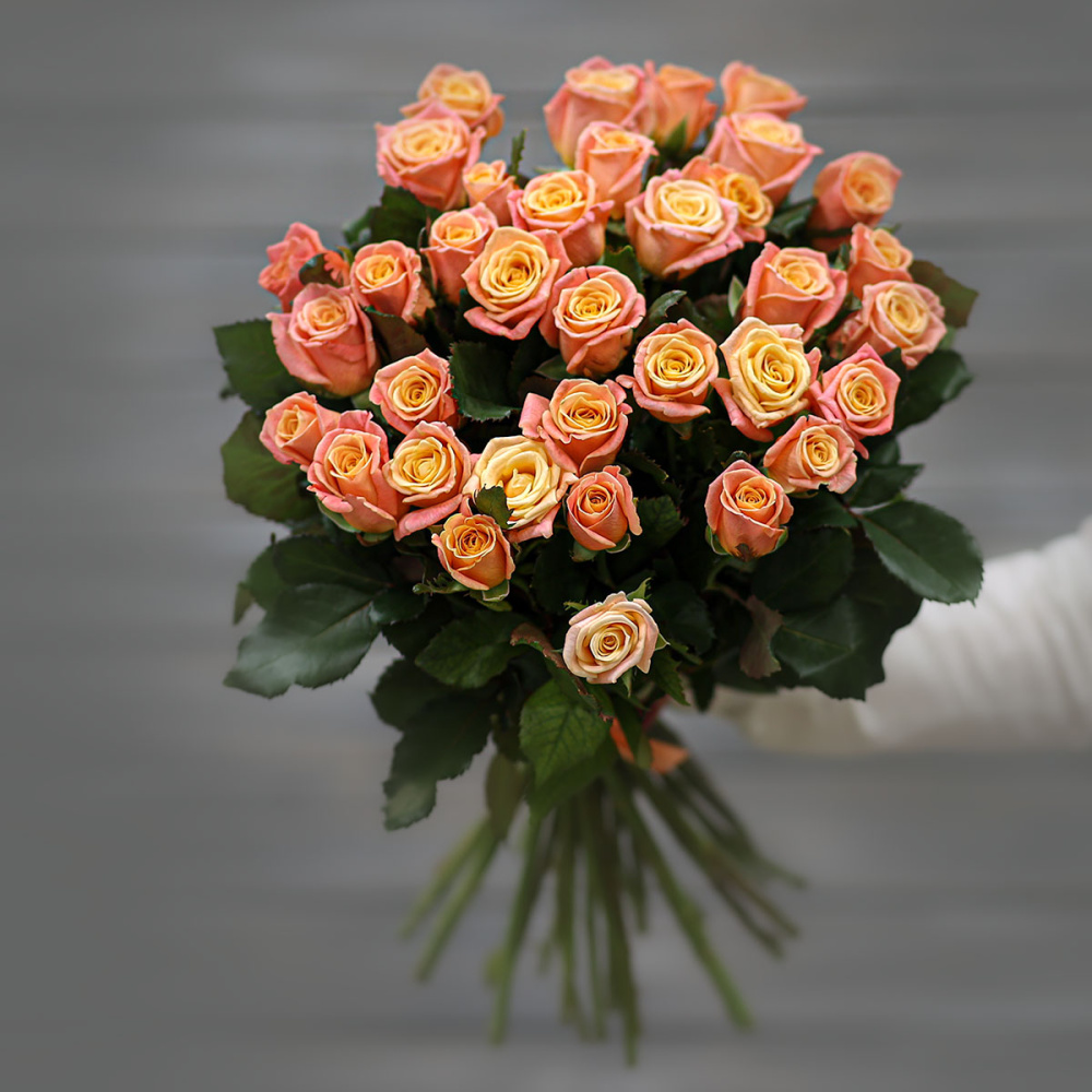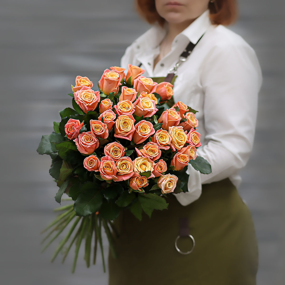 Букет из 35 персиковых роз (Россия) с лентой 60 см