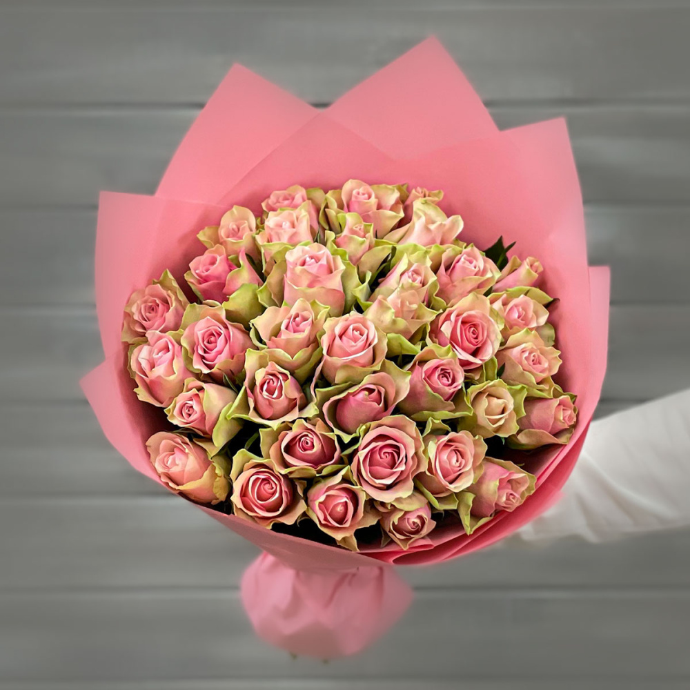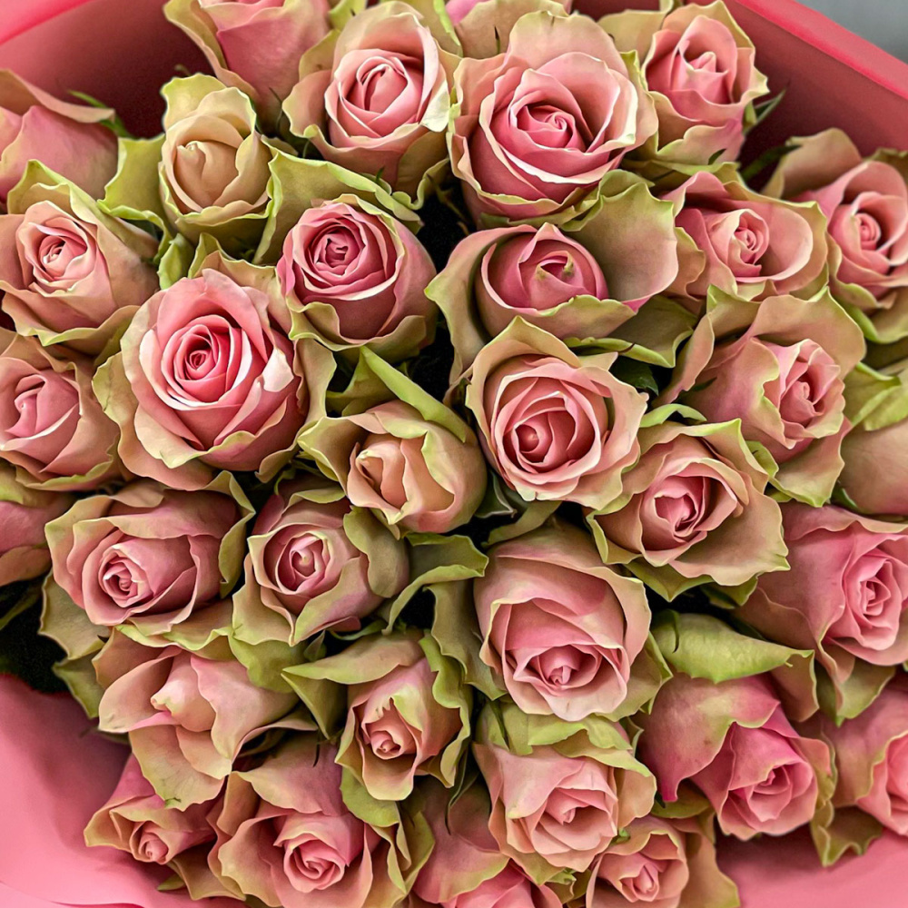Букет из 39 зелено-розовых роз в упаковке Кения 40 см.