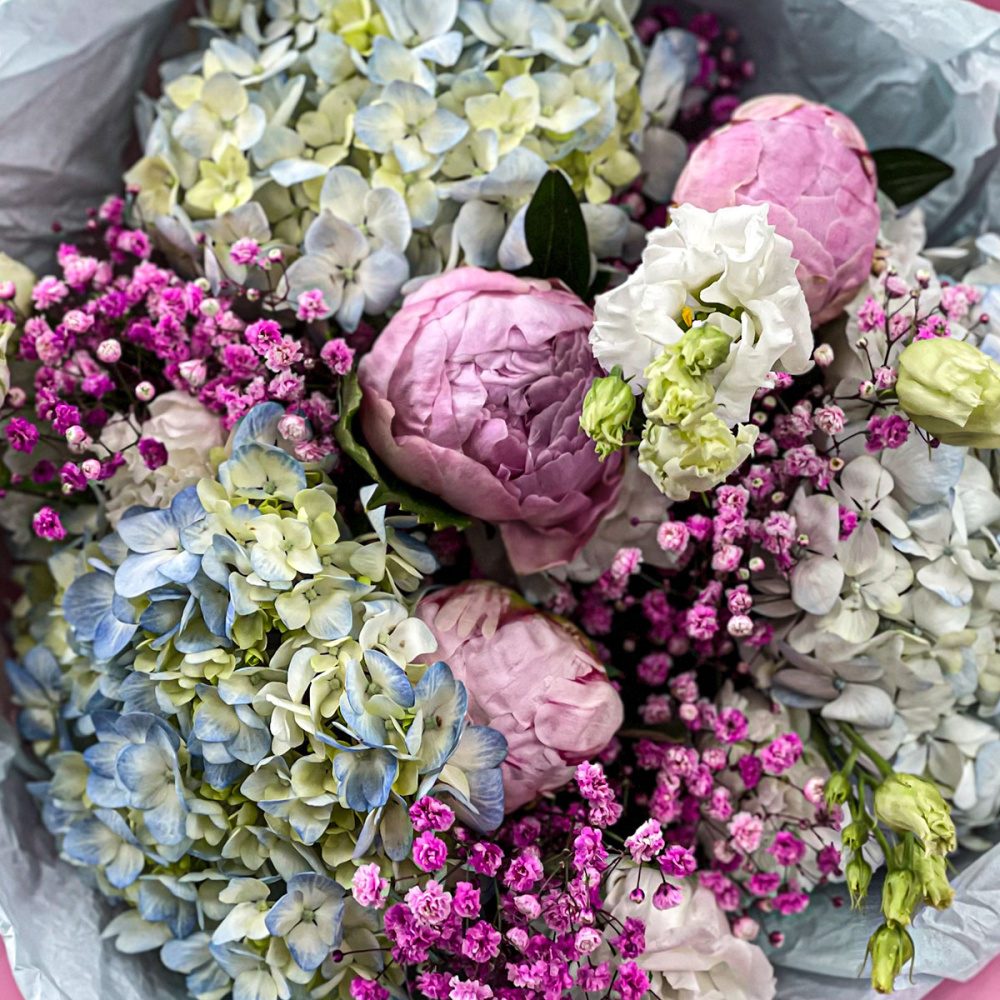 Гортензия,Пион высший сорт,Гипсофила краш.,Лизиантус,Листья фисташки,Бумага упаковочная Тишью,Лента,Упаковка в ассортименте,Плёнка прозрачная