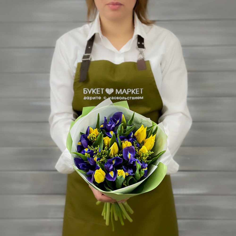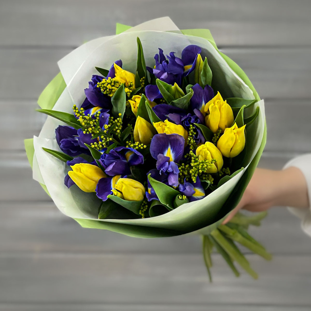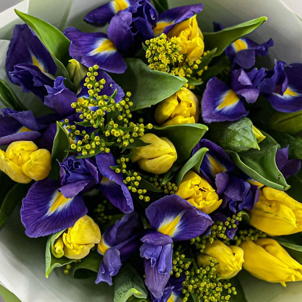 Ирис,Тюльпан,Солидаго микс,Упаковка в ассортименте,Лента,Плёнка прозрачная