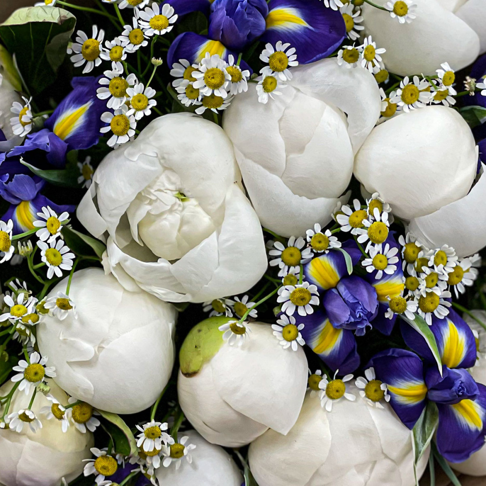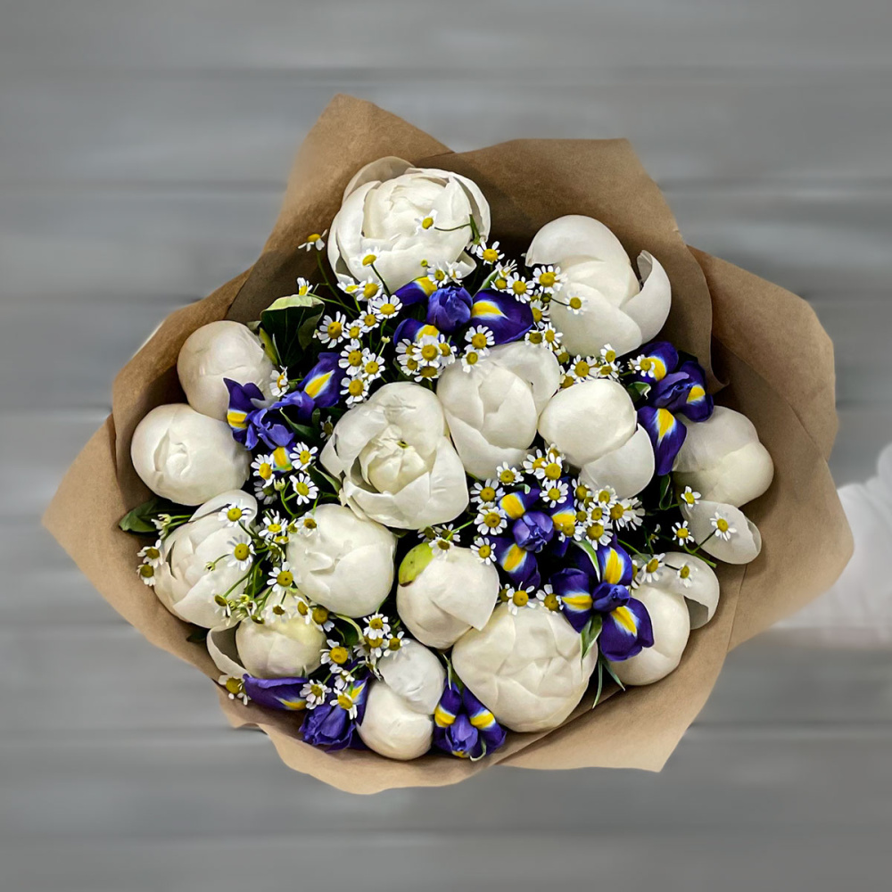 Пион высший сорт,Ирис,Ромашка (Танацетум),Листья фисташки,Лента,Бумага упаковочная Крафт,Плёнка прозрачная