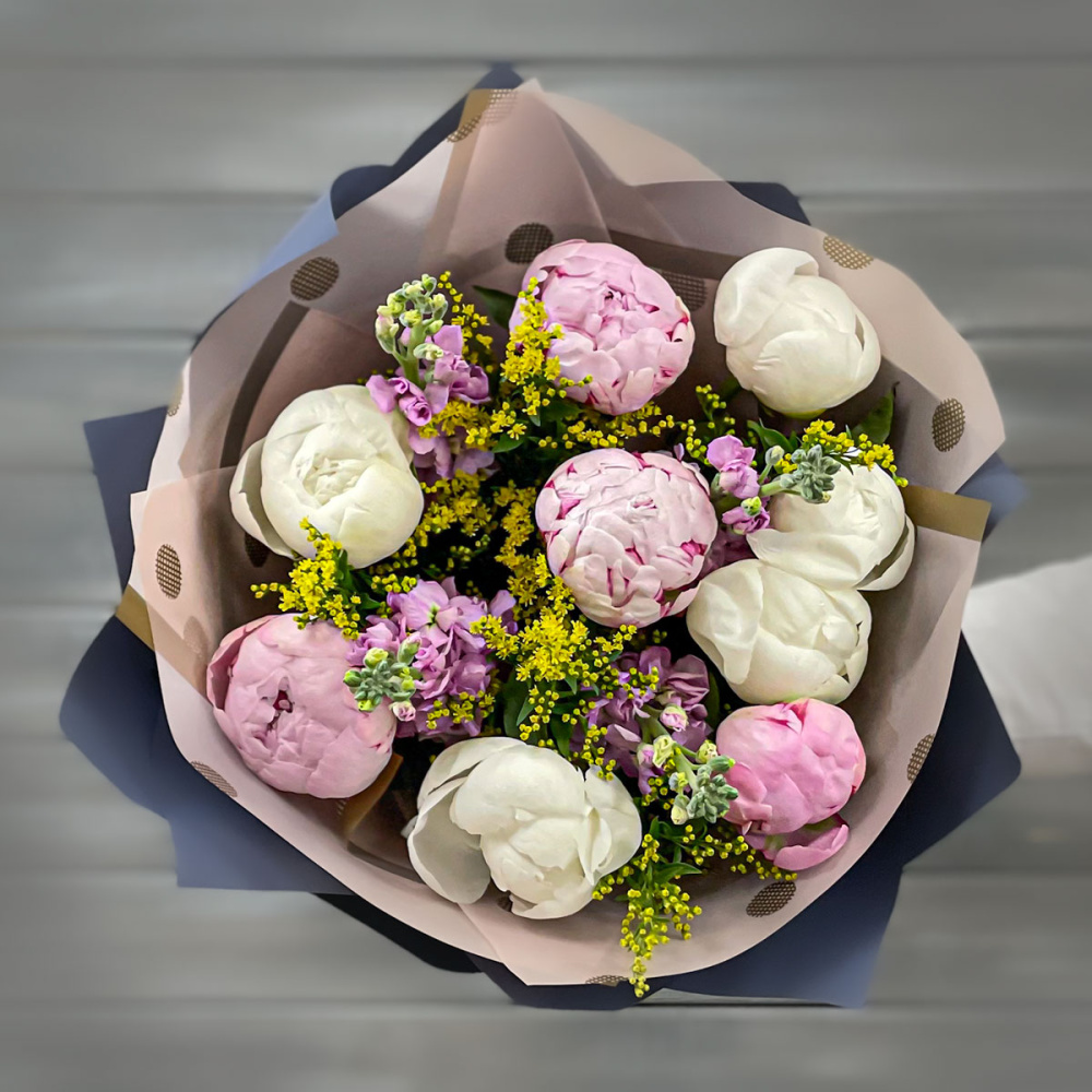 Пион высший сорт,Маттиола кустовая ,Солидаго микс,Листья фисташки,Лента,Упаковка в ассортименте,Плёнка прозрачная