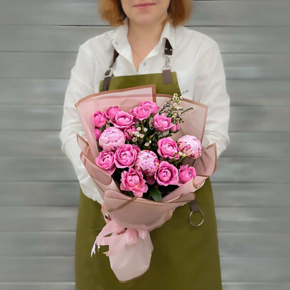 Роза кустовая Клустер,Пион высший сорт,Хамелациум,Листья фисташки,Лента,Упаковка в ассортименте,Плёнка прозрачная