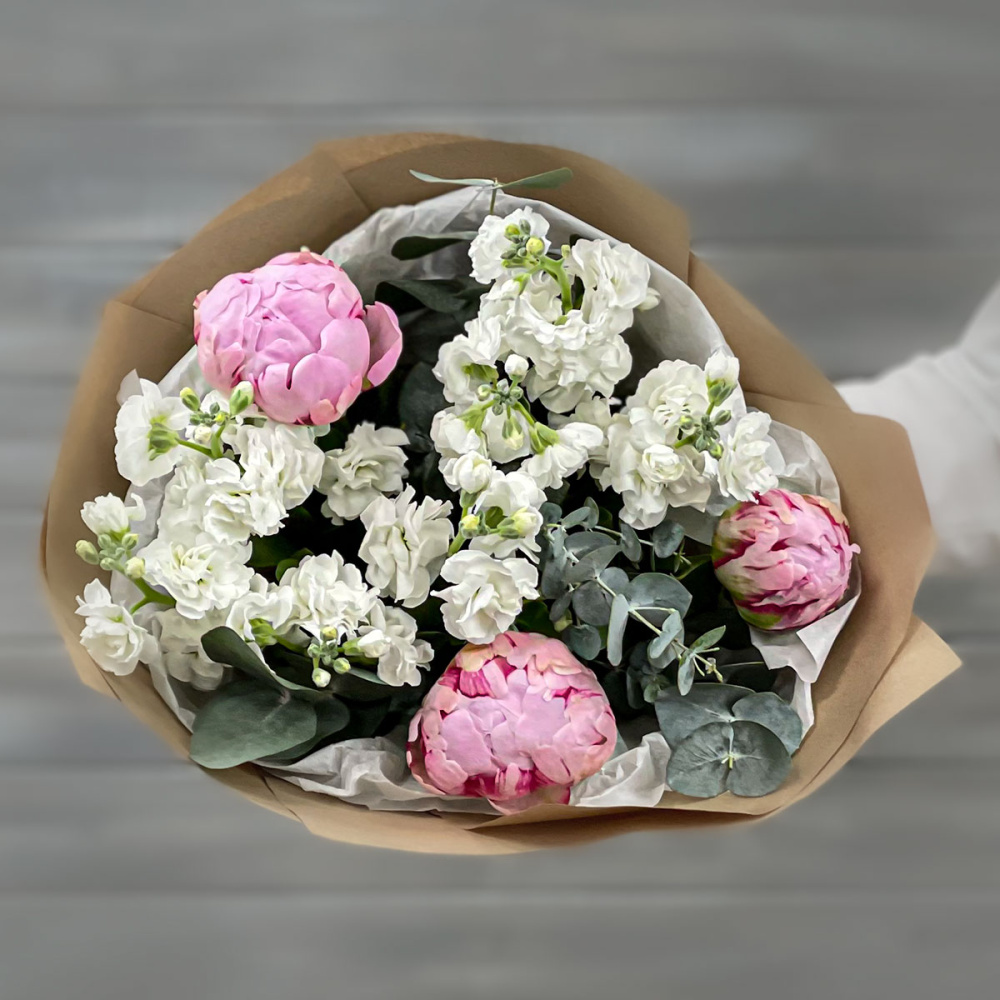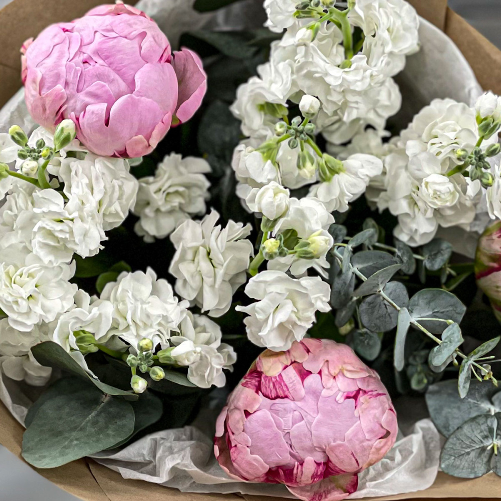 Пион высший сорт,Маттиола кустовая ,Листья эвкалипт микс,Листья фисташки,Бумага упаковочная Крафт,Лента,Бумага упаковочная Тишью,Плёнка прозрачная