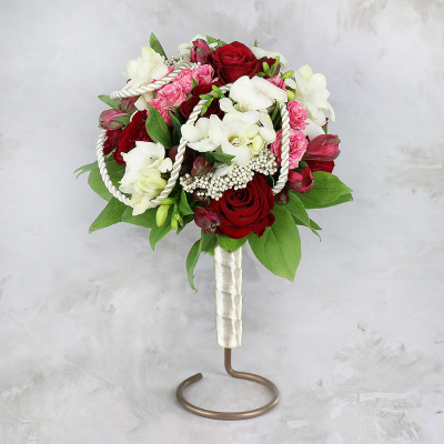 Букет невесты из белой фрезии, красных роз и альстромерии| 6 800 Р | без скидки |