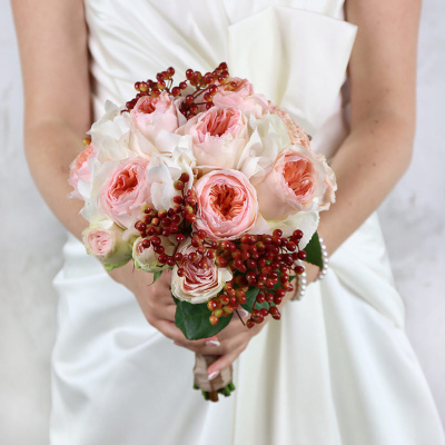 Гортензия белая, Роза Александра розовая, Роза кустовая Клустер кремовая, Вибурнум ягоды (ШТ), Листья питтоспорума микс, Лента, Плёнка прозрачная