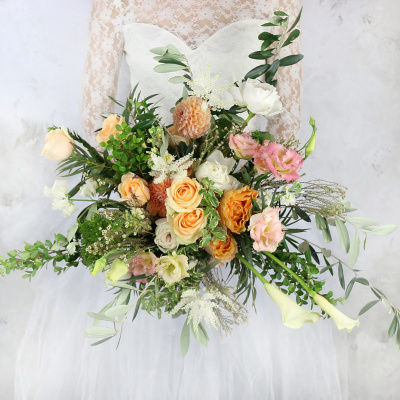 Георгина оранжевая, Ежевика (Рубус), Калла 60 см белая, Роза Александра розовая, Роза Вувузела кремовая, Латирус фиолетовый, Астильба розовая, Лизиантус, Гвоздика лунная фиолетовая, Амарантус, Ягоды шиповника (Боттел ), Листья хедера (пучок), Роза кустовая Клустер кремовая, Роза РС 40 см кремовая, Лента