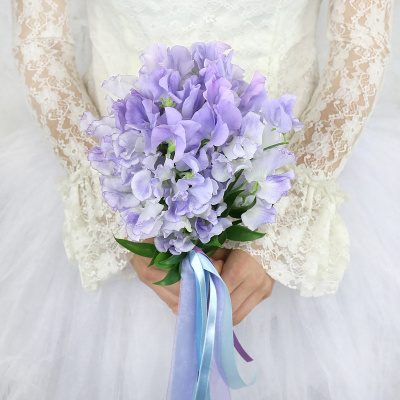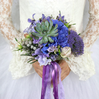 Гиацинт синий, Гортензия белая, Трахелиум фиолетовый, Латирус фиолетовый, Капс Бруниа, Эхеверия микс (D12), Клематис фиолетовый, Роза кустовая Клустер кремовая, Фрезия белая, Лента