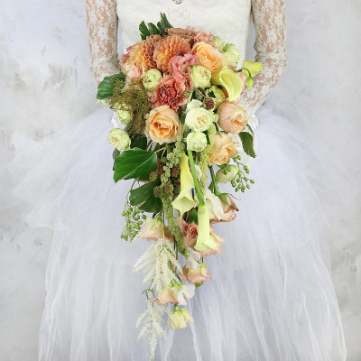 Каскадный букет невесты из роз, калл и лизиантуса| 18 200 Р | без скидки |