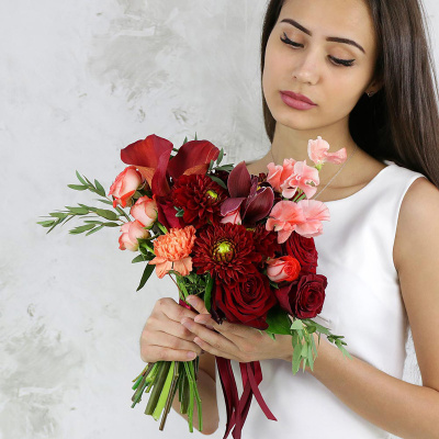 Георгина оранжевая, Орхидея Цимбидиум белая, Калла 60 см белая, Роза 30 см красная, Роза 40 см розовая, Роза кустовая 50 см оранжевая, Латирус фиолетовый, Листья салал, Листья эвкалипт микс, Гвоздика оранжевая, Листья фисташки, Лента, Плёнка прозрачная
