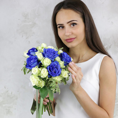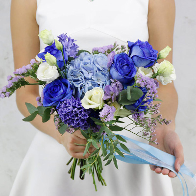 Гортензия белая, Гиацинт синий, Роза 70 см синяя, Роза 40 см розовая, Фрезия белая, Лизиантус, Статица, Лимониум фиолетовый, Листья эвкалипт микс, Лента, Плёнка прозрачная