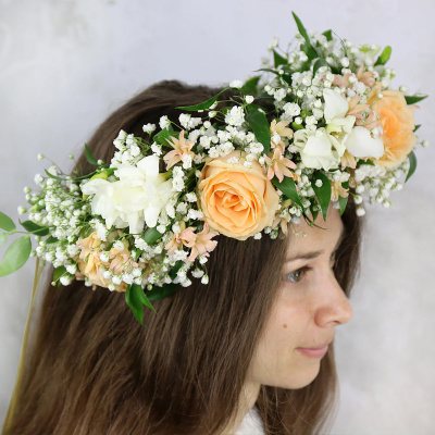 Венок на голову невесты из роз, гиацинтов с гипсофилой| 5 400 Р | без скидки |