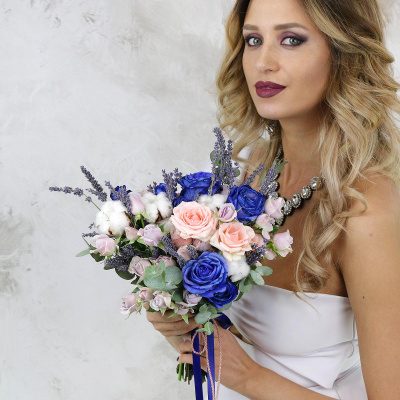 Букет невесты из роз, лаванды и хлопка| 9 600 Р | без скидки |
