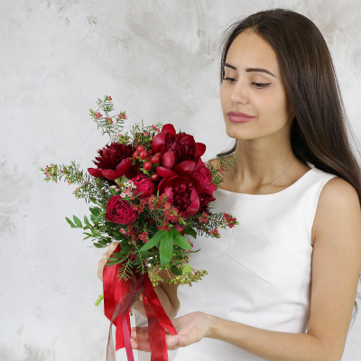 Пион коралловый, Роза кустовая Клустер кремовая, Гиперикум красный, Хамелациум, Листья фисташки, Вибурнум тинус (пучок), Лента, Плёнка прозрачная