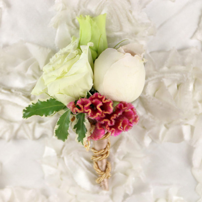 Бутоньерка из лизиантуса, розы и целозии| 3 000 Р | без скидки |
