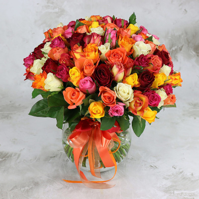 Букет из 101 разноцветной розы с лентой Кения 40 см.| 9 500 Р | без скидки |