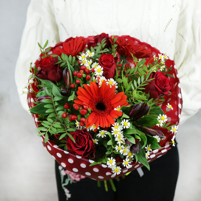 Гербера Акция красная,Гиперикум красный,Роза Кения 40 Мадам ред,Ромашка (Танасетум),Листья фисташки,Альстромерия красная,Упаковка в ассортименте,Лента,Плёнка прозрачная