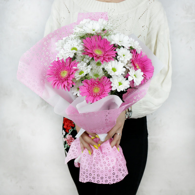 Гербера розовая - 4 шт; Хризантема кустовая белая ромашка - 5 шт; Паникум - 2 шт; Упаковка в ассортименте - 1 шт; Лента - 1 шт; Плёнка прозрачная - 1 шт.